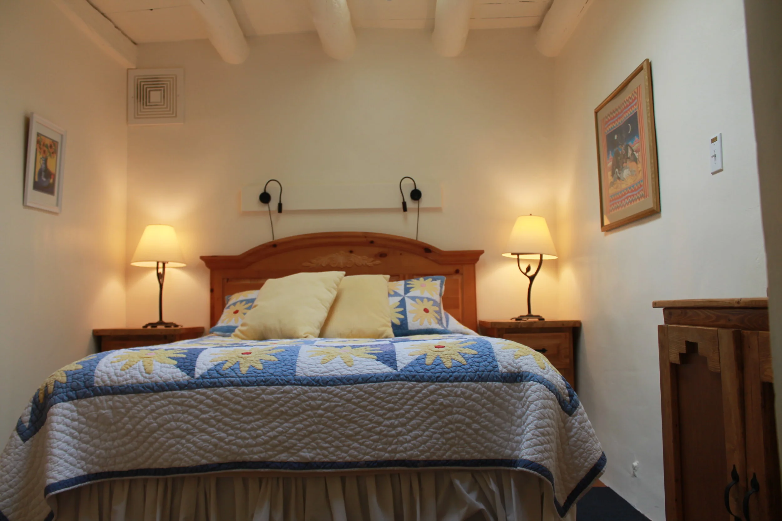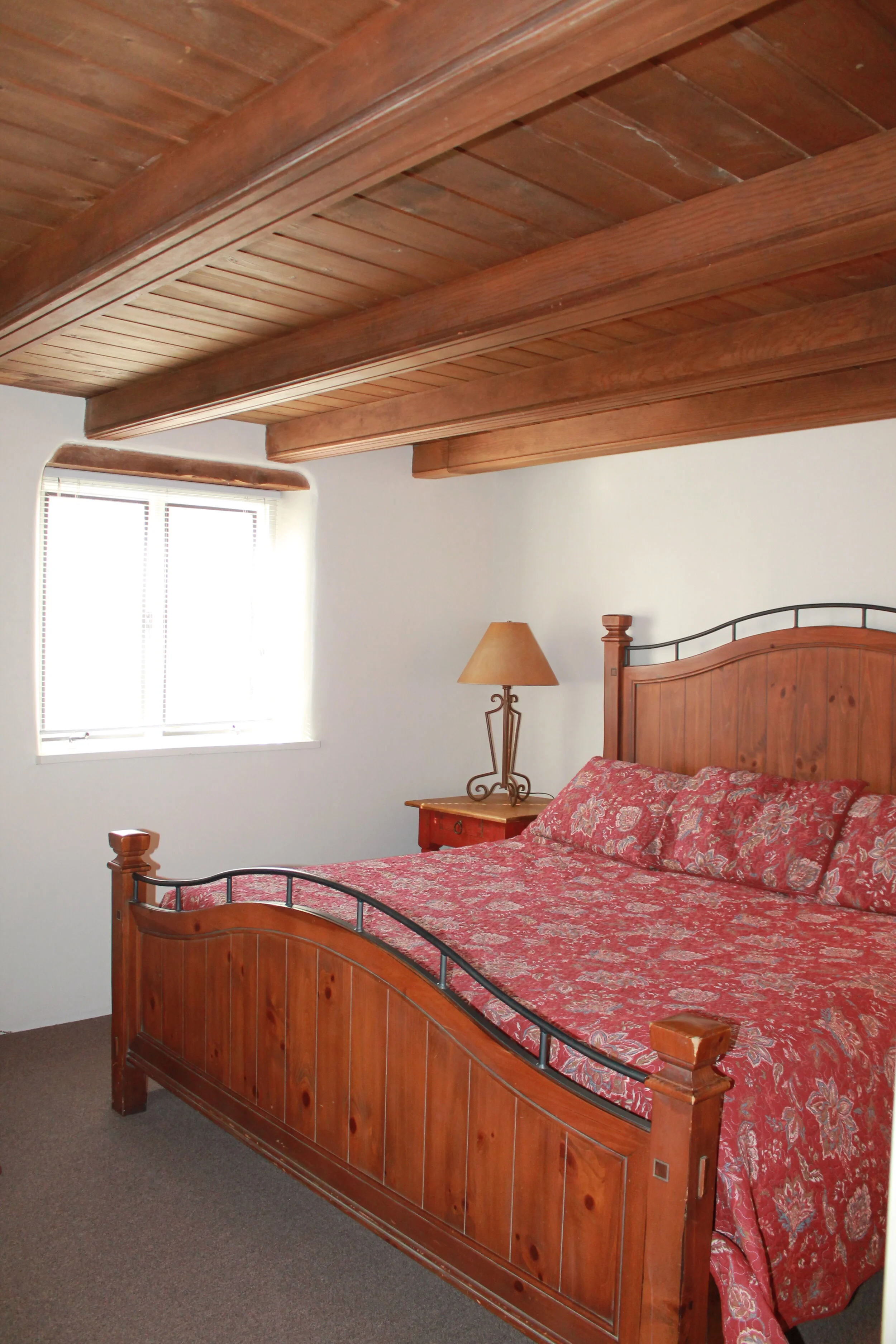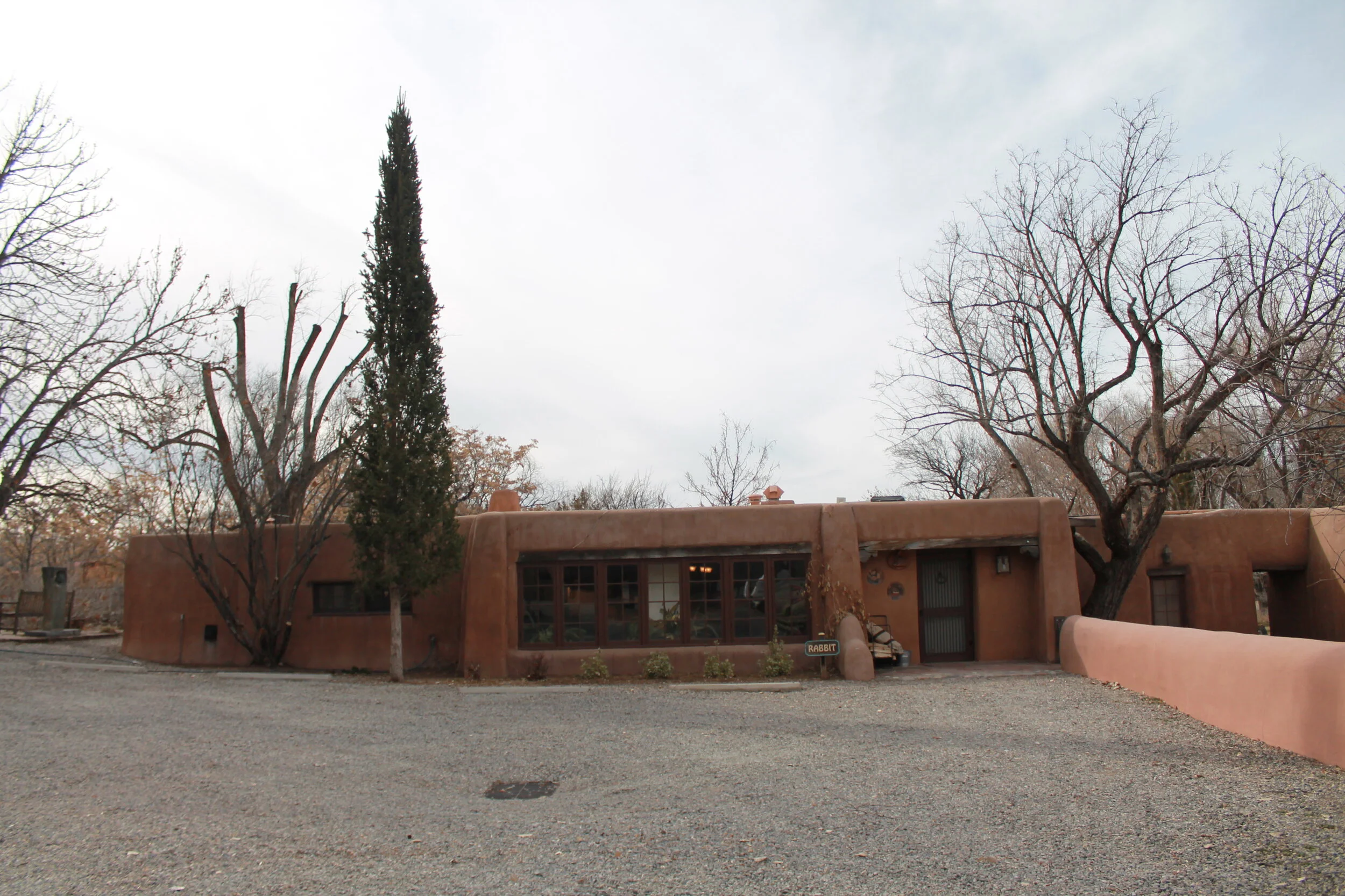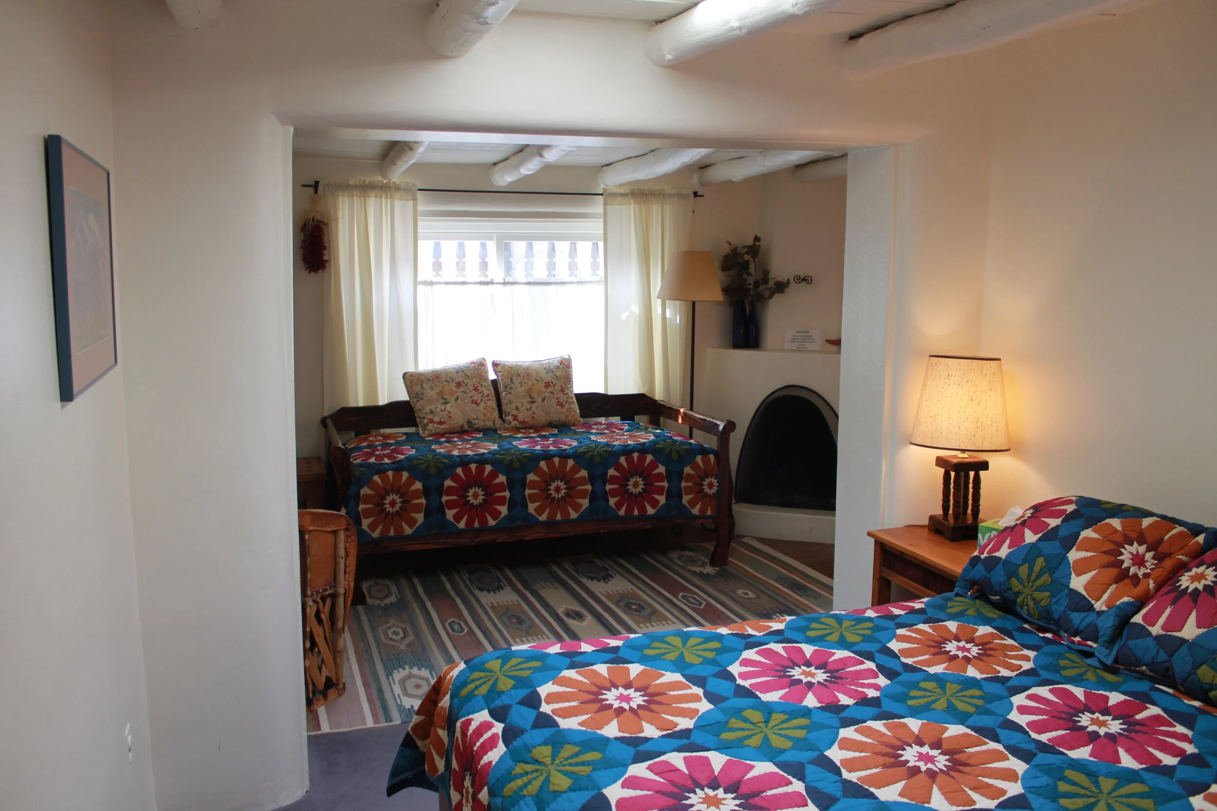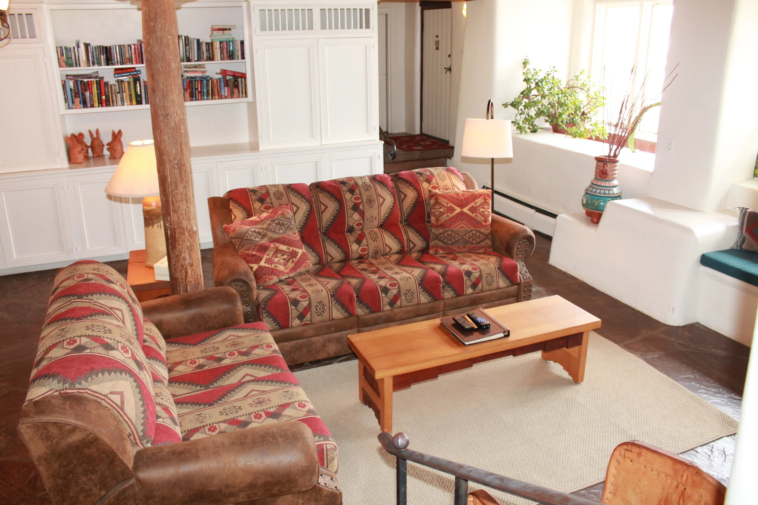 Constructed with stone floors, beautiful adobe walls and wooden ceilings, Rabbit house has a wonderfully earthy, authentic vibe. Rabbit was originally built with just a few rooms and was added onto over a number of years, as were many older New Mexican houses. Lacking modern construction machinery to level the ground under an entire house, each additional room was built at ground level, with steps going up or down as needed.